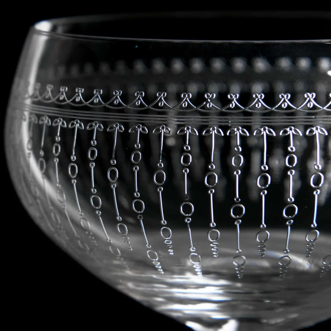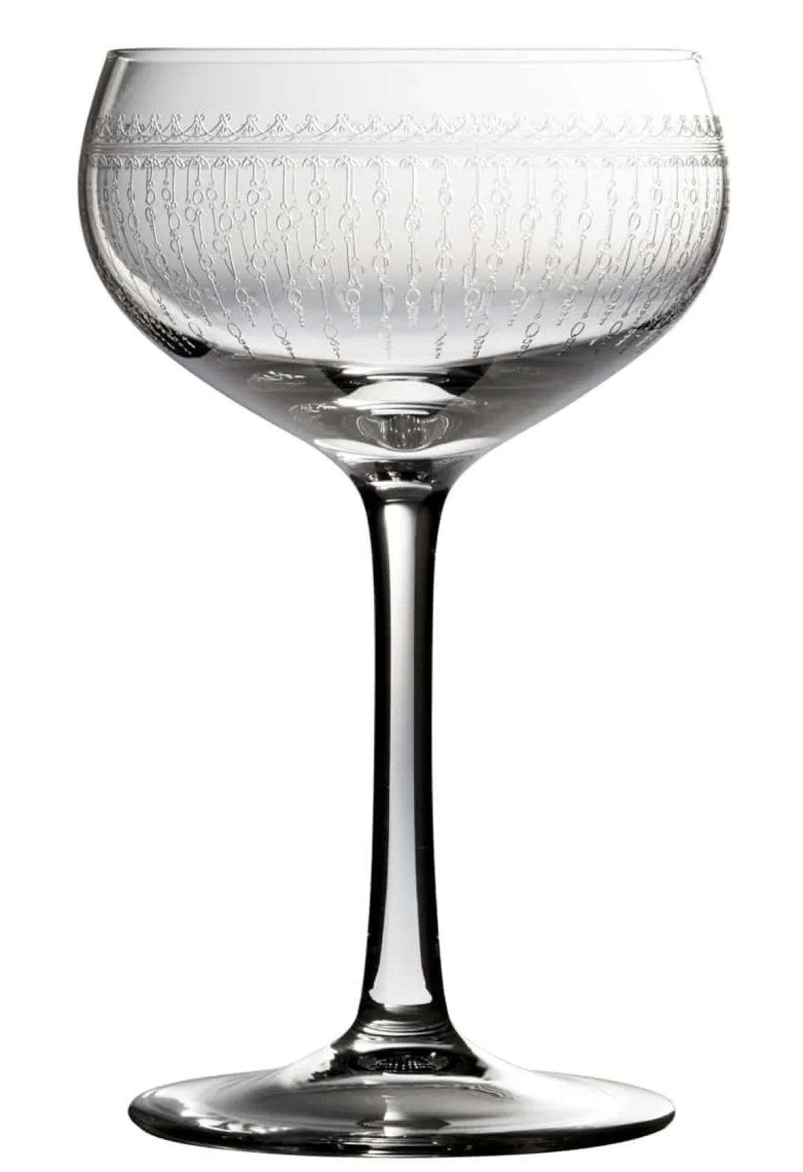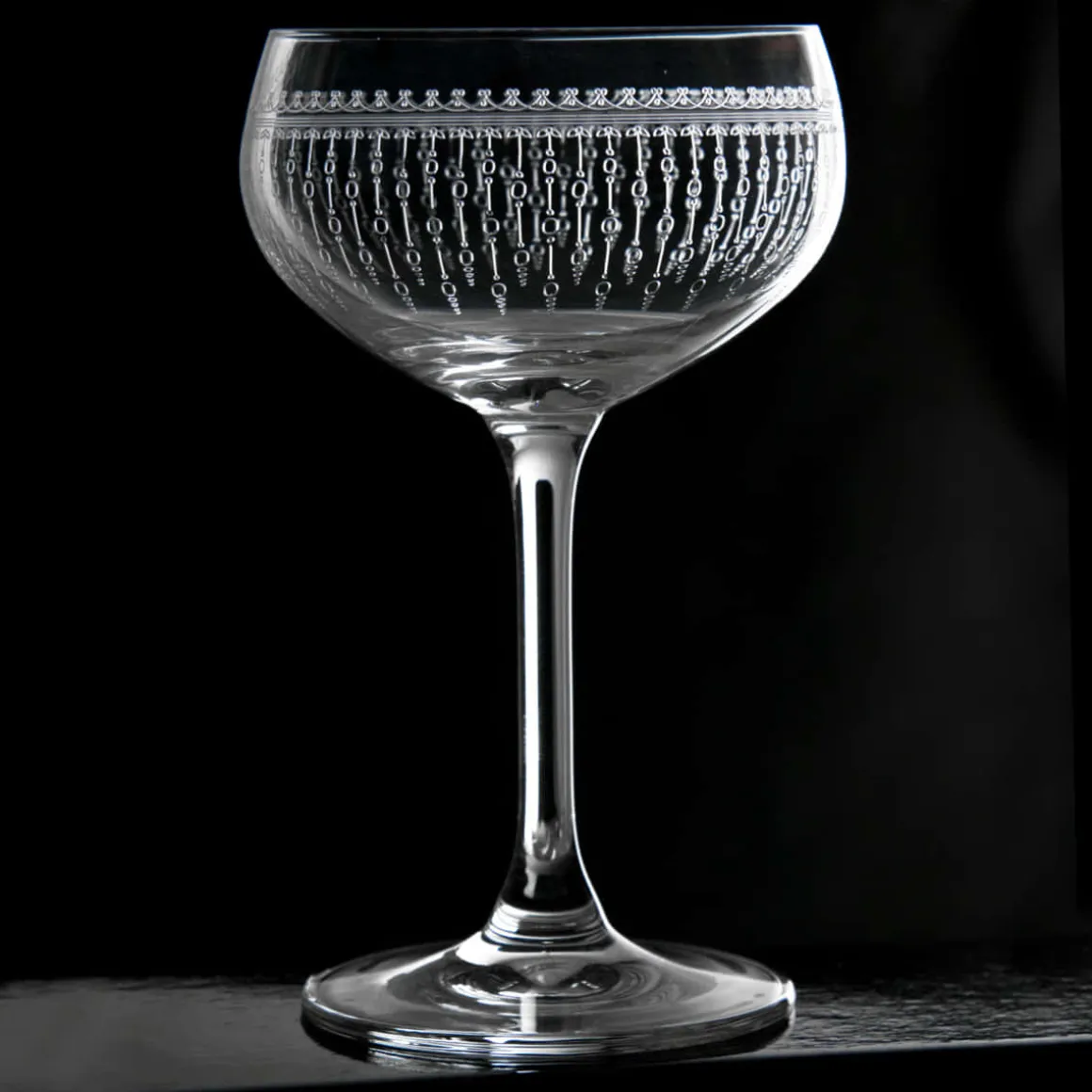 Passend zur Renaissance der Cocktailkultur vom Anfang des letzten Jahrhunderts hat diese Variante des Retro Coupe eine feine eingeätzte Verzierung im Stil der 1920er Jahre.