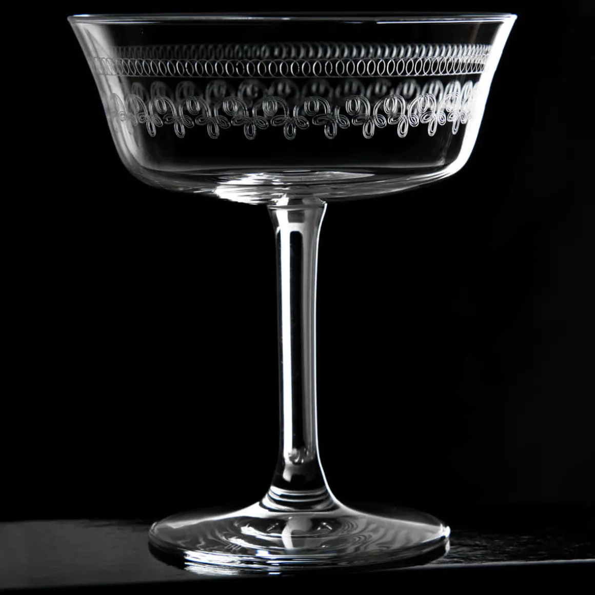 Das Retro Fizzio Cocktailglas ist auch in Uni und drei weiteren verzierten Varianten erhältlich. Außerdem sind Tumbler, Longdrinkgläser und 5 weitere Cocktailschalen mit 1910er Verzierung erhältlich.