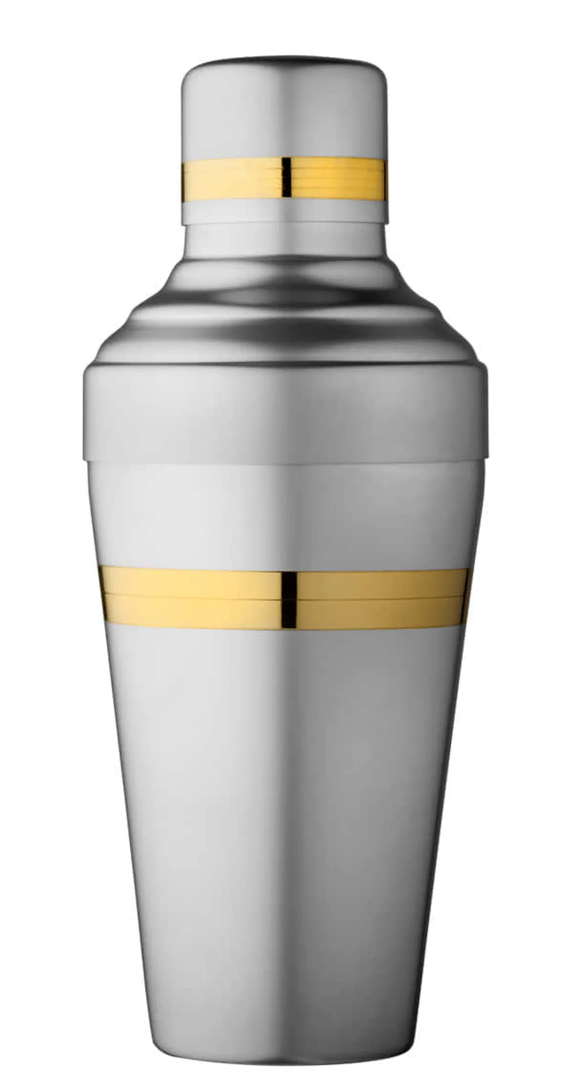 Bei dieser Variante des Cocktailshakers wurde der Becher und die Verschlusskappe mit vergoldeten Ringen veredelt.