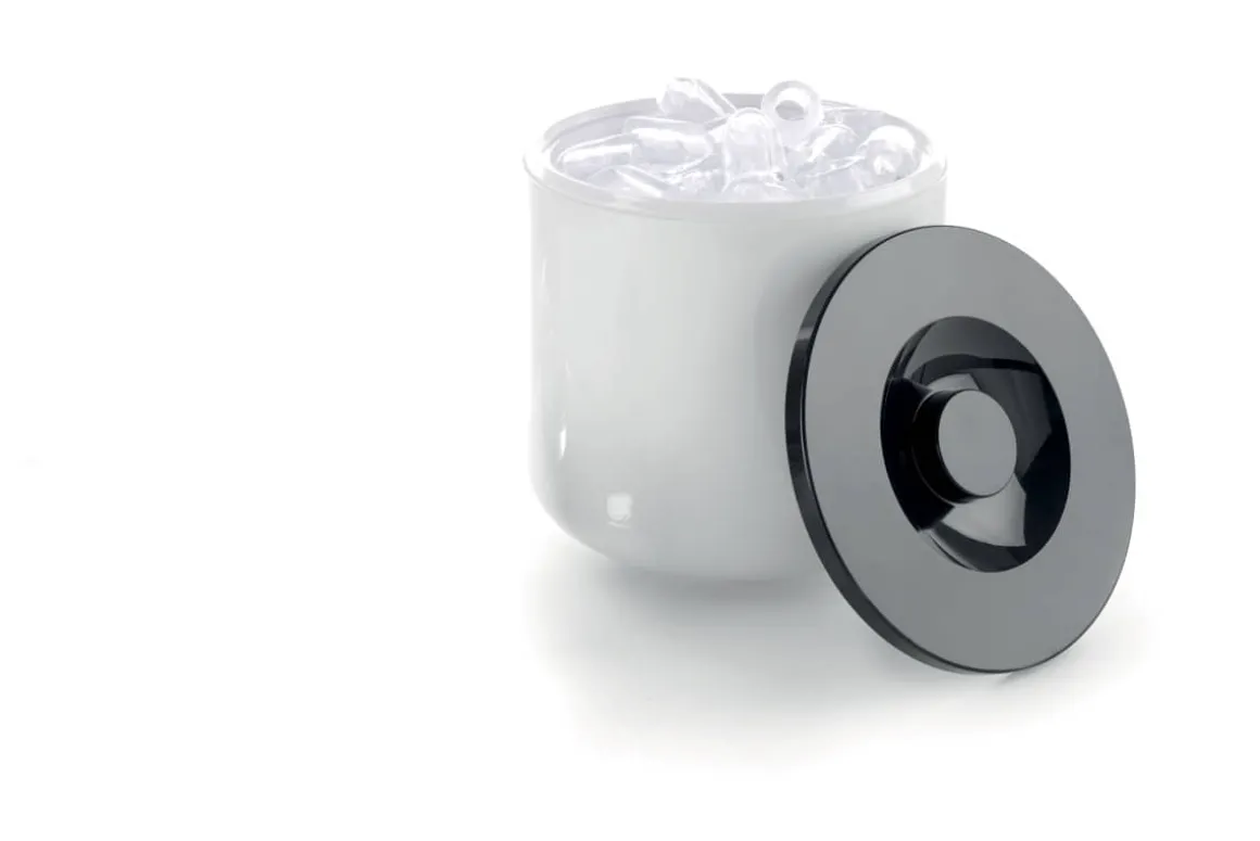 Der doppelwandige Eiseimer ist aus Kunststoff hergestellt und besitzt einen herausnehmbaren Einsatz für die Eiswürfel. Dieser Eiseinsatz ist etwas kürzer als der außere Eimer und hat Löcher im Boden, so dass getautes Wasser nicht an den Eiswürfeln bleibt. Zusammen mit dem Deckel sorgt dies für längere Haltbarkeit der Eiswürfel im Eimer.