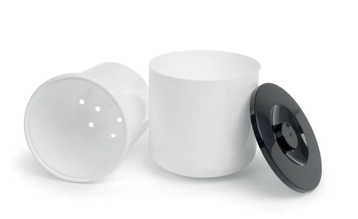 Der doppelwandige Eiseimer ist aus Kunststoff hergestellt und besitzt einen herausnehmbaren Einsatz für die Eiswürfel. Dieser Eiseinsatz ist etwas kürzer als der außere Eimer und hat Löcher im Boden, so dass getautes Wasser nicht an den Eiswürfeln bleibt. Zusammen mit dem Deckel sorgt dies für längere Haltbarkeit der Eiswürfel im Eimer.