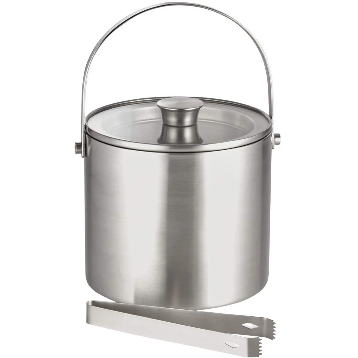 Eiseimer aus Edelstahl mit Glasdeckel und Eiswürfelzange im Set. Der silberfarbene Eiseimer hat ein Volumen von 3 Liter und ist doppelwandig gefertigt, um die Eiswürfel besonders gut zu isolieren.