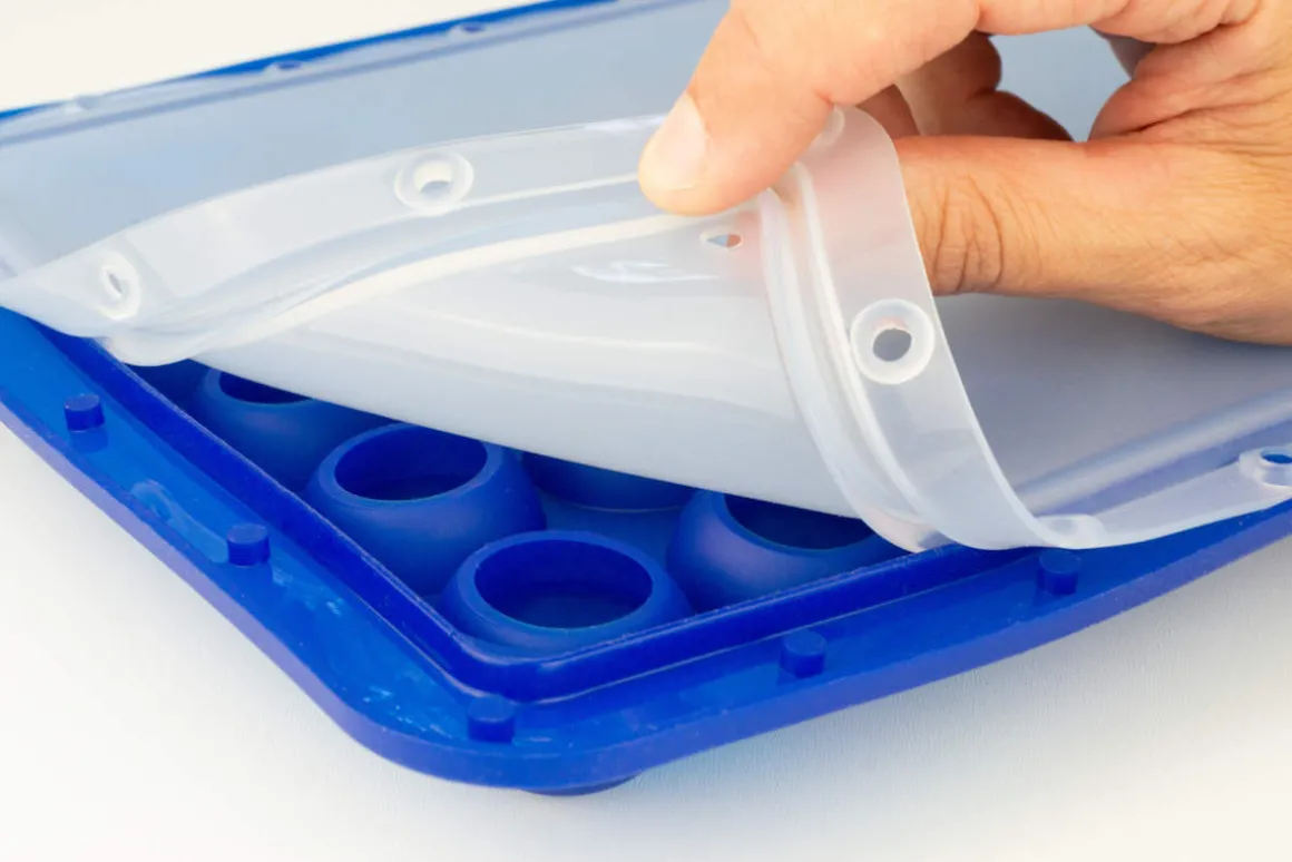 Der transparente Deckel wird umlaufend auf Noppen befestigt. Zusammen mit der integrierten Dichtkante kann so ein Auslaufen beim Tragen der Eiswürfelform verhindert werden. Außerdem schützt der Deckel die Eiswürfel vor Verunreinigungen und ermöglicht das Stapeln der Eiswürfelformen im Eisfach oder dass anderes Tiefkühlgut auf die Form gestellt werden kann ohne dass die Eiswürfel in Kontakt mit Verpackungen kommt.
