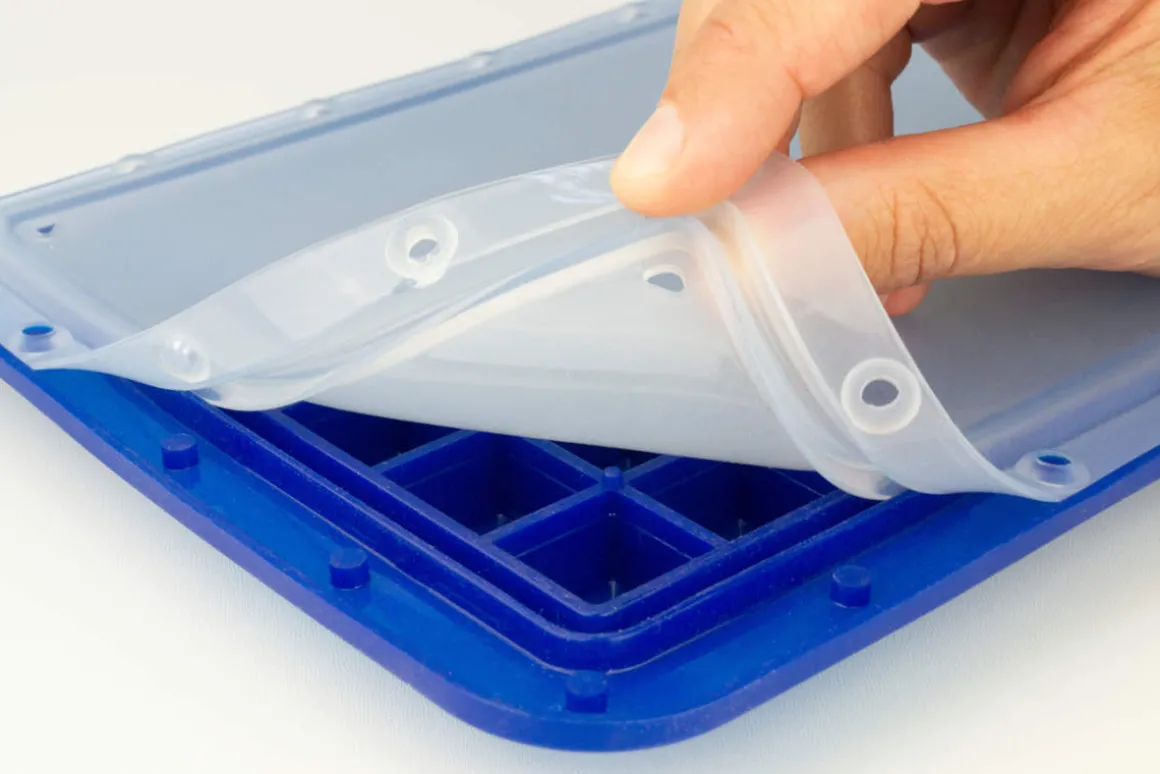 Der transparente Deckel wird umlaufend auf Noppen befestigt. Zusammen mit der integrierten Dichtkante kann so ein Auslaufen beim Tragen der Eiswürfelform verhindert werden. Außerdem schützt der Deckel die Eiswürfel vor Verunreinigungen und ermöglicht das Stapeln der Eiswürfelformen im Eisfach oder dass anderes Tiefkühlgut auf die Form gestellt werden kann ohne dass die Eiswürfel in Kontakt mit Verpackungen kommt.