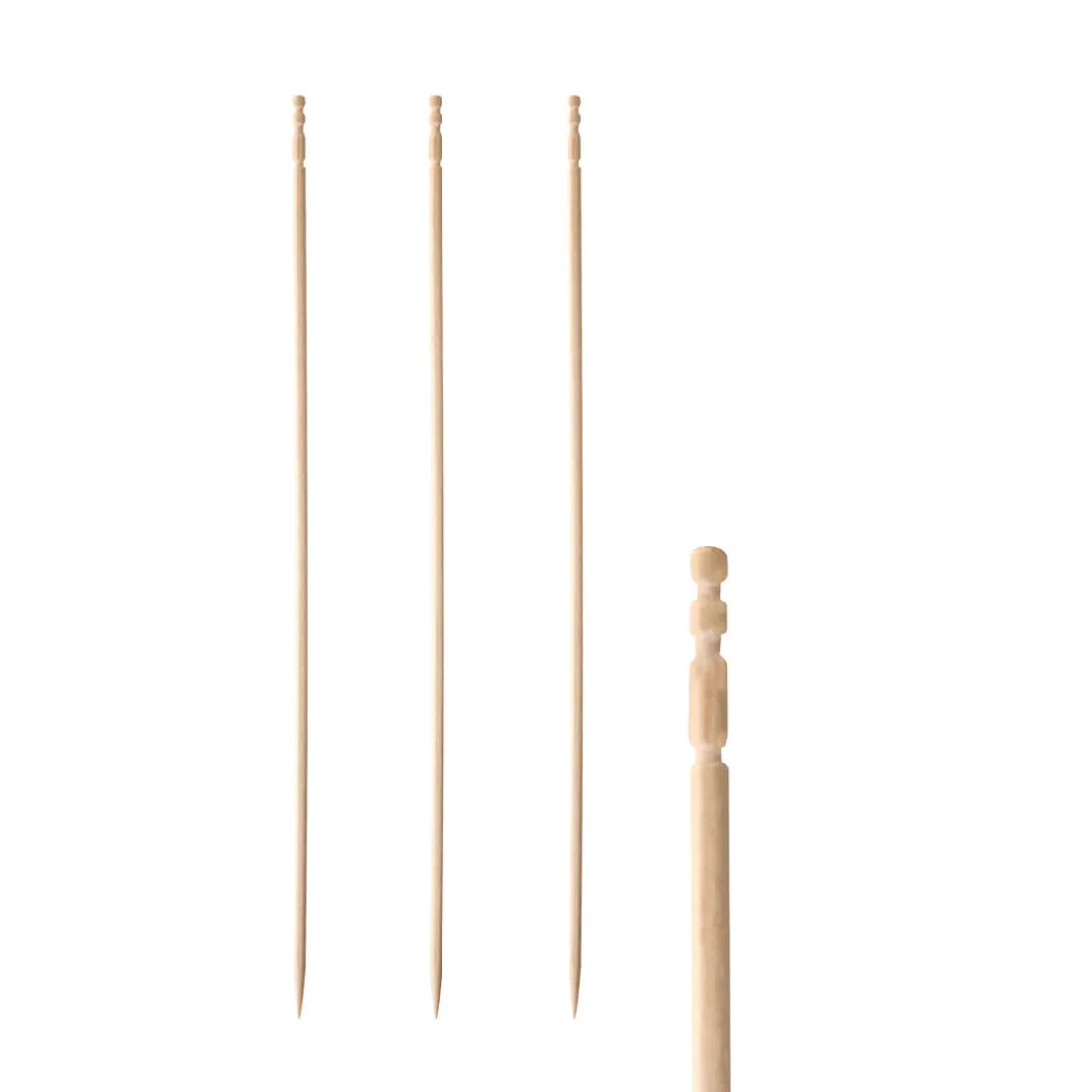 Die Holzspieße sind auf einer Seite spitz und auf der anderen Seite abgerundet mit Verzierungen gedrechselt.