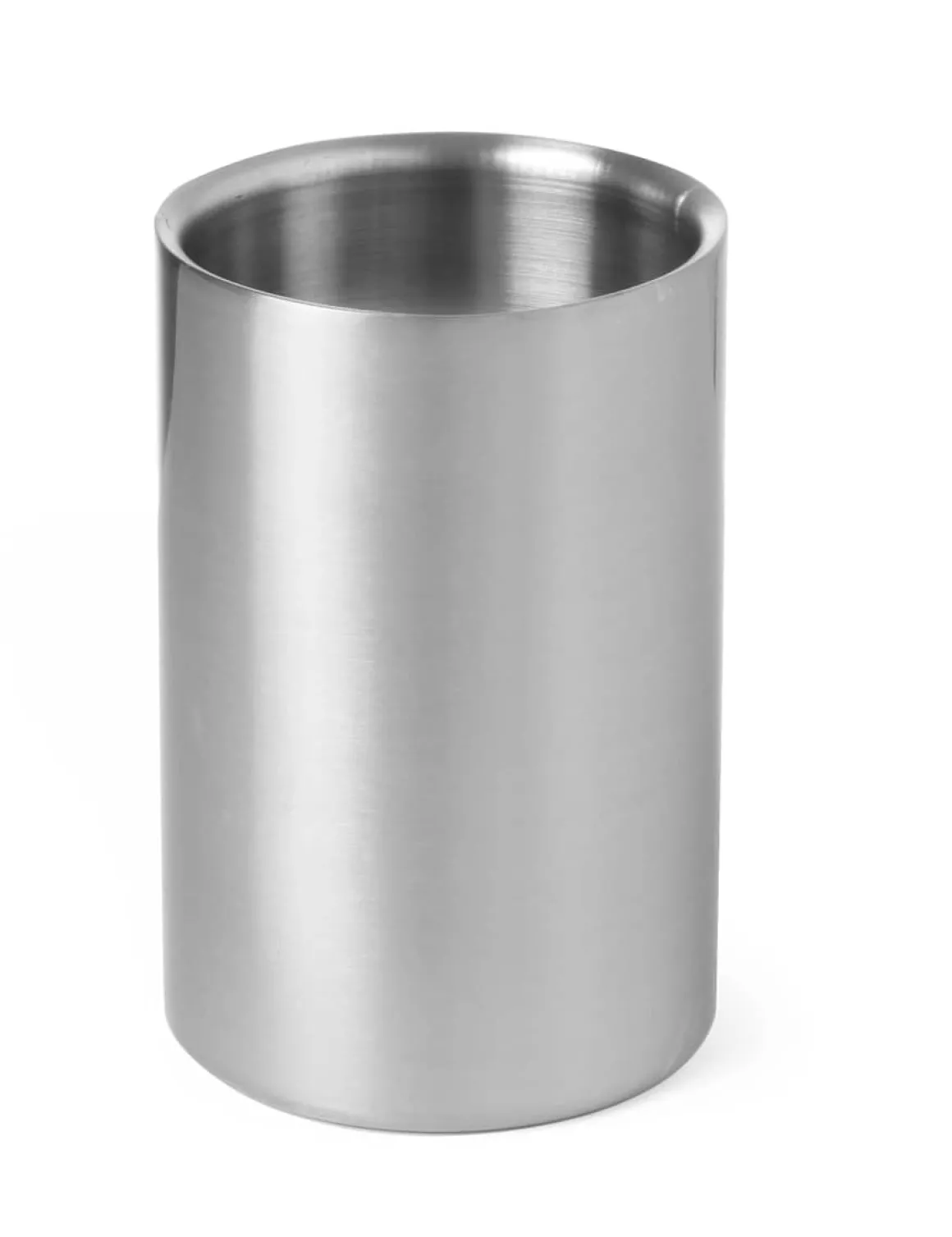 Zylinderförmiger Flaschenkühler aus Edelstahl. Durch seine doppelwandige Fertigung wird kein Eis zum Kühlen benötigt. Edle Optik durch mattes Finish der Außenseite.