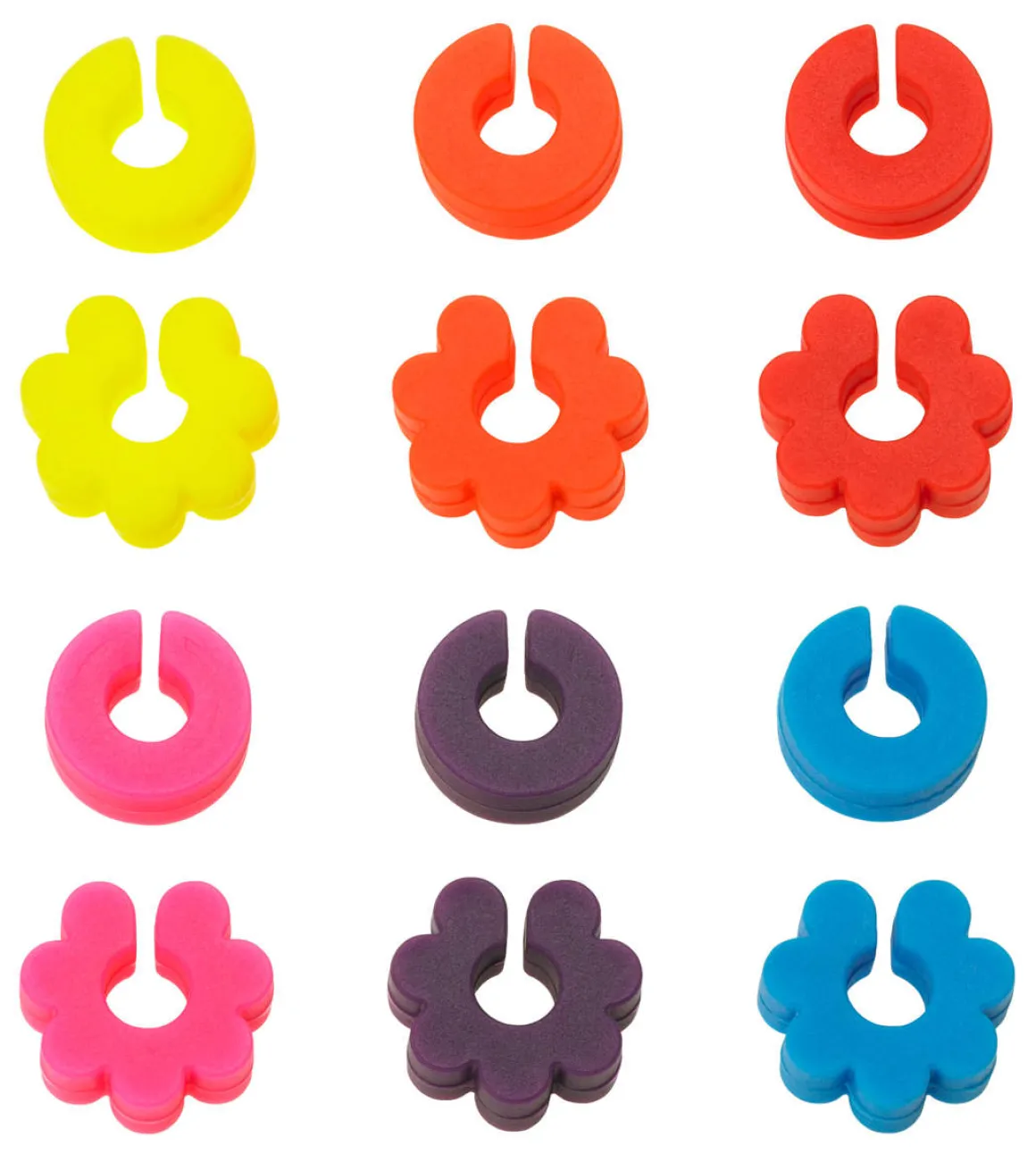 12 Glasmarkierer für Wein- und Sektgläser aus Silikon von Lurch. Jedes Set besteht aus 12 Glasmarkierern in zwei unterschiedlichen Formen und 6 verschiedenen Farben. So können 12 Stielgläser eindeutig und auf dekorative Art gekennzeichnet werden.