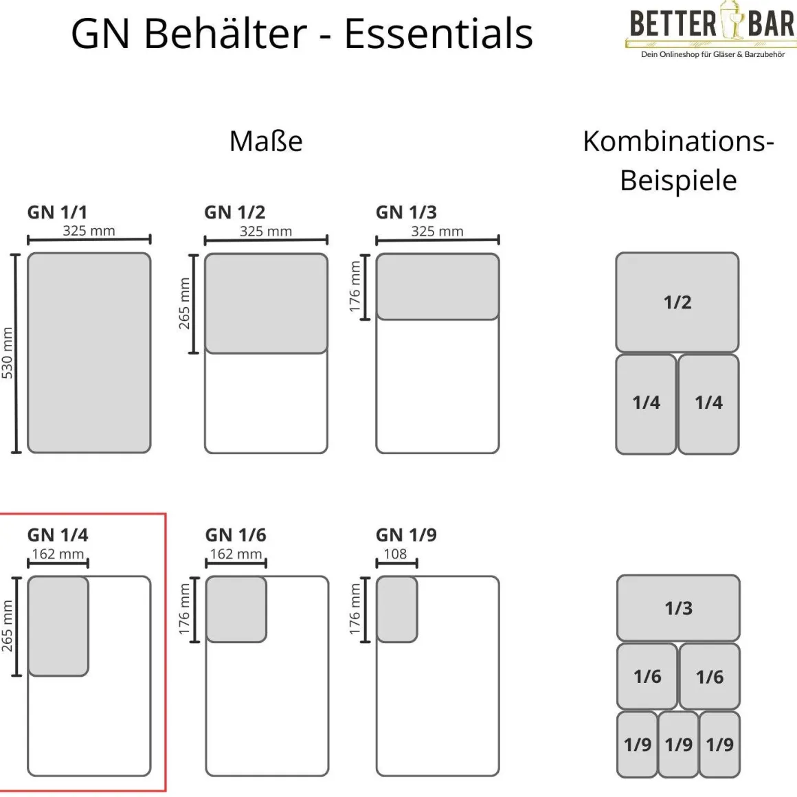 Gastronormbehälter GN 1/4, Höhe 6,5 cm aus der Serie GN Essentials mit den Maßen 26,5 x 16,2 cm ist aus Chromnickelstahl gefertigt und ideal für die professionelle Küchenorganisation. Die Serie bietet eine solide und kostengünstige Lösung für den täglichen Einsatz in Gastronomie, Catering und Gemeinschaftsverpflegung.