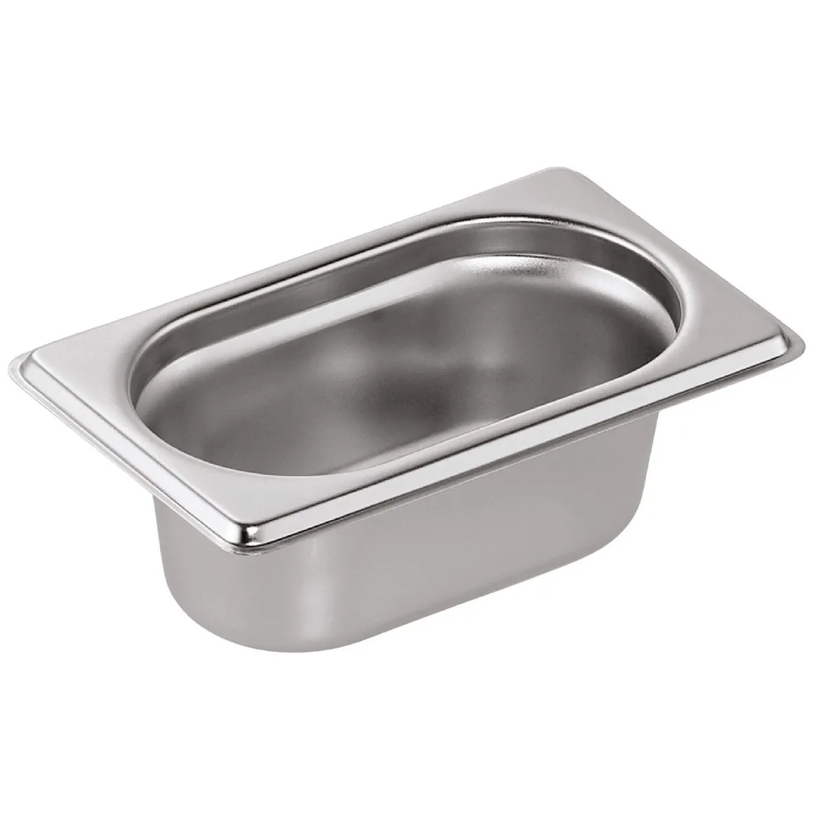 Gastronormbehälter GN 1/9, Höhe 6,5 cm aus der Serie GN Essentials mit den Maßen 17,6 x 10,8 cm ist aus Chromnickelstahl gefertigt und ideal für die professionelle Küchenorganisation. Die Serie bietet eine solide und kostengünstige Lösung für den täglichen Einsatz in Gastronomie, Catering und Gemeinschaftsverpflegung.