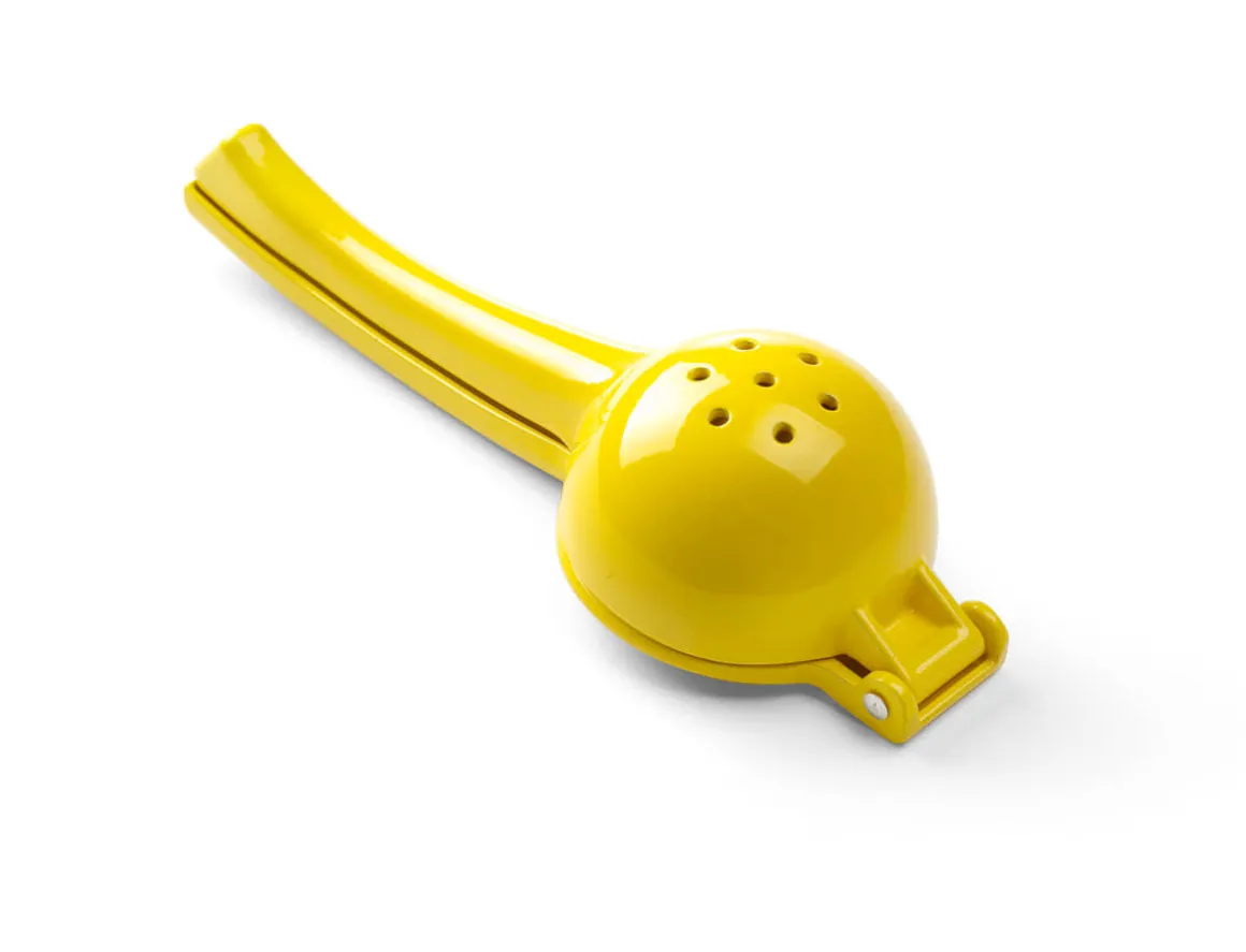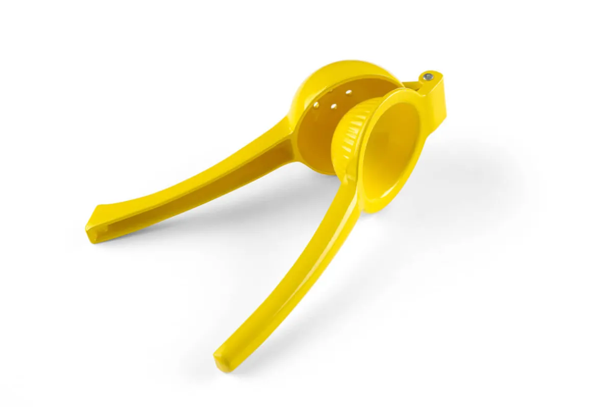 Die Handsaftpresse ist aus Aluminium hergestellt und Gelb pulverbeschichtet. Die Größe der Presse ist passend für Zitronen.