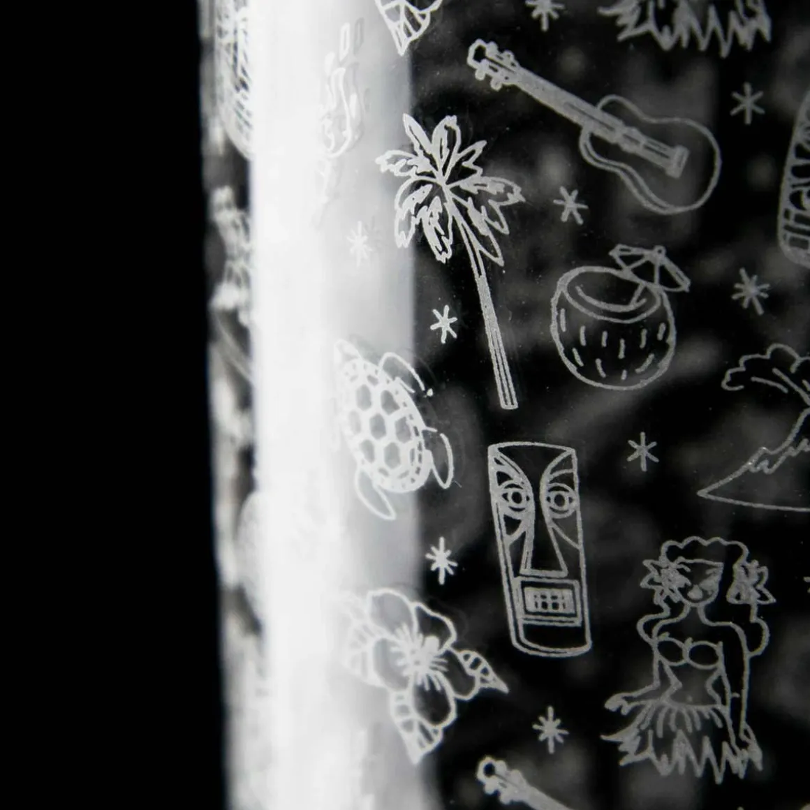 Das Highball Glas mit Tiki Verzierung besitzt ein Volumen von 300 ml. Das klassisch geformte Highball Glas ist mit typischen Tiki Motiven wie Kokosnüssen, Ananas, Palmen, Vulkanen und Schildkröten verziert. Die eingeätzten weißen Motive sind spülmaschinenfest und beständig auf dem Glas.