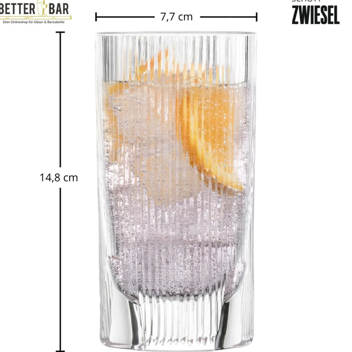 Longdrinkglas aus der Serie Fave von Schott Zwiesel. Das moderne Longdrinkglas wurde mit einem eingeschliffenen Linienmuster verziert. Der stabile Boden sorgt für einen sicheren Stand.