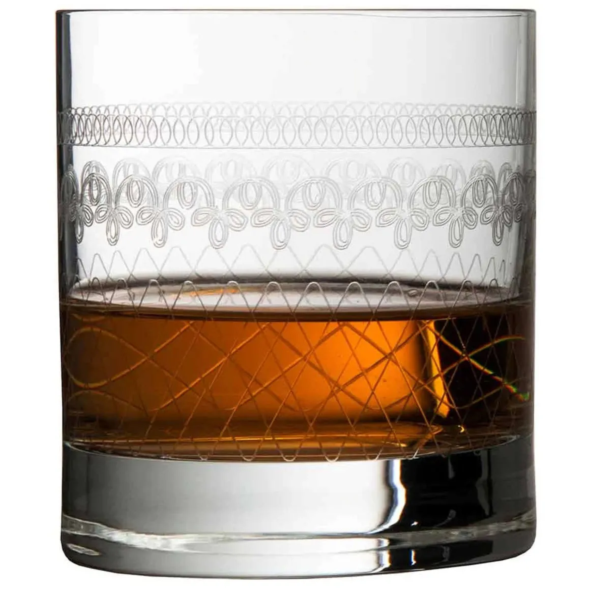 Das Old Fashioned Glas ist im unteren Bereich mit einem feinen Rautenmuster verziert und darüber liegen zwei umlaufende geschwungene Bänder im Stil der 1910er Jahre, dem goldenen Zeitalter der Cocktailkultur. Die Verzierung ist in das Kristallglas beständig eingeätzt, ist spülmaschinenfest und bleibt dauerhaft auf dem Glas sichtbar.