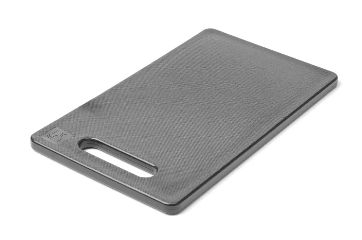Schneidbrett aus Polyethylen (HDPE) mit geriffelter Oberfläche. Mit Grifföffnung zum Tragen und Aufhängen.