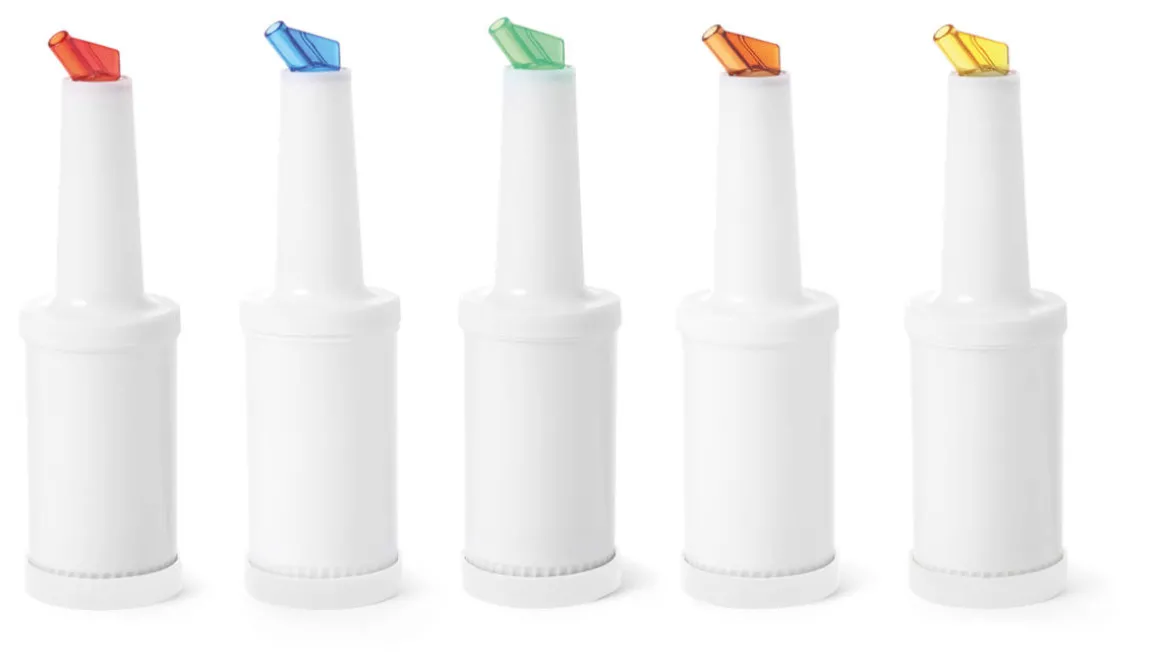 Weiße Speedbottle für Säfte, Cocktails, Mixer Öl, Dressing und andere Flüssigkeiten. Mit fünf farbigen Ausgießern (rot, blau, grün, gelb, orange) zum schnellen Unterscheiden von mehreren Flaschen. Die Ausgießer mit Luftloch stellen einen gleichmäßigen Ausfluss sicher.