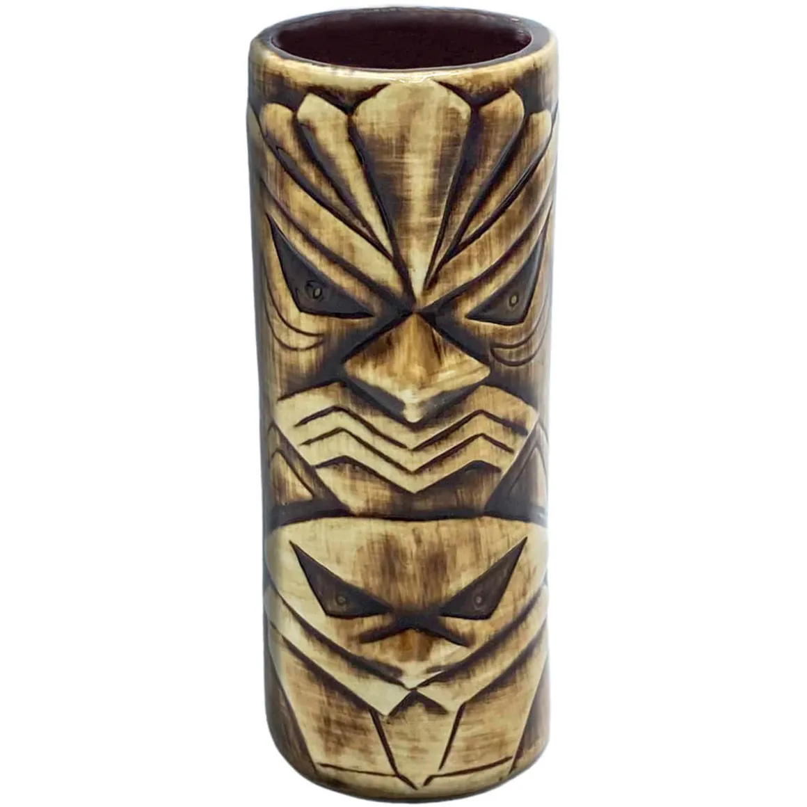 Die Außenseite des Tiki Bechers ist cremefarben mit dunkelbraunen Akzenten. Die Stärke der dunkelbraunen Akzente unterscheiden sich von Becher zu Becher. Die Innenseite des Tiki Glases ist ebenfalls Dunkelbraun.