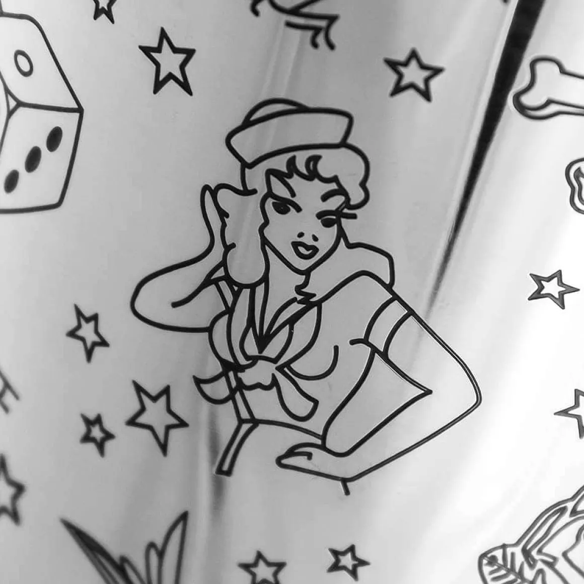 Cocktailshaker bestehend aus zwei Edelstahlbechern. Die silbernen Tins sind mit typischen Tattoo-Motiven wie Herzen, Sternen, Vögeln und Segelschiffen verziert.