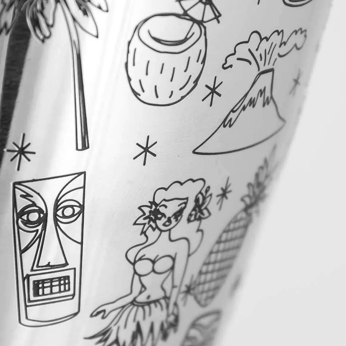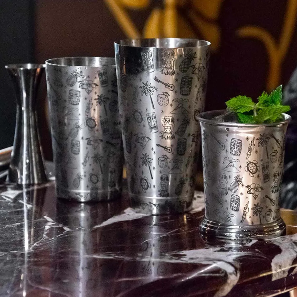 Cocktailshaker bestehend aus zwei Edelstahlbechern. Die silbernen Tins sind mit typischen Tiki-Motiven wie Kokosnüssen, Ananas, Palmen, Vulkanen und Schildkröten verziert. Bringen sie Urlaubsfeeling in ihre Cocktailbar.