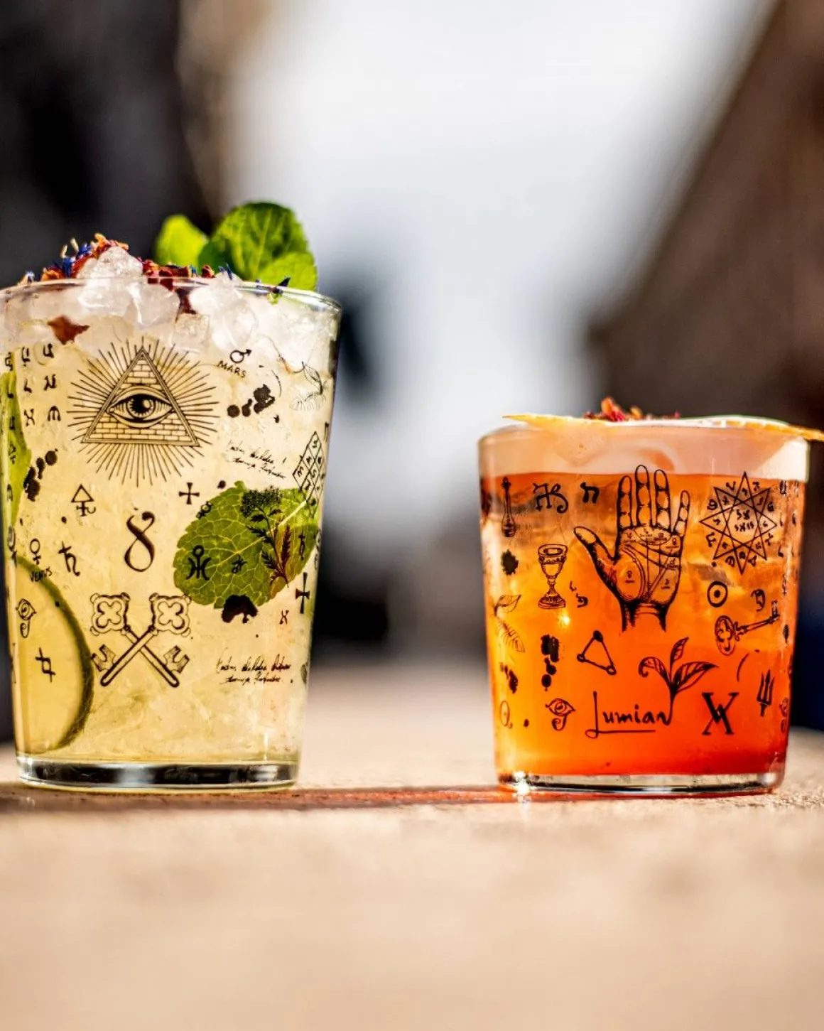 Die Symbole auf dem Tumbler bestehen aus schwarz-anthrazitfarbenem Siebdruck und sind spülmaschinenfest. Damit eignen sich die Gläser aus gehärtetem Glas auch für den Einsatz in Bars, Hotels und Speakeasys.