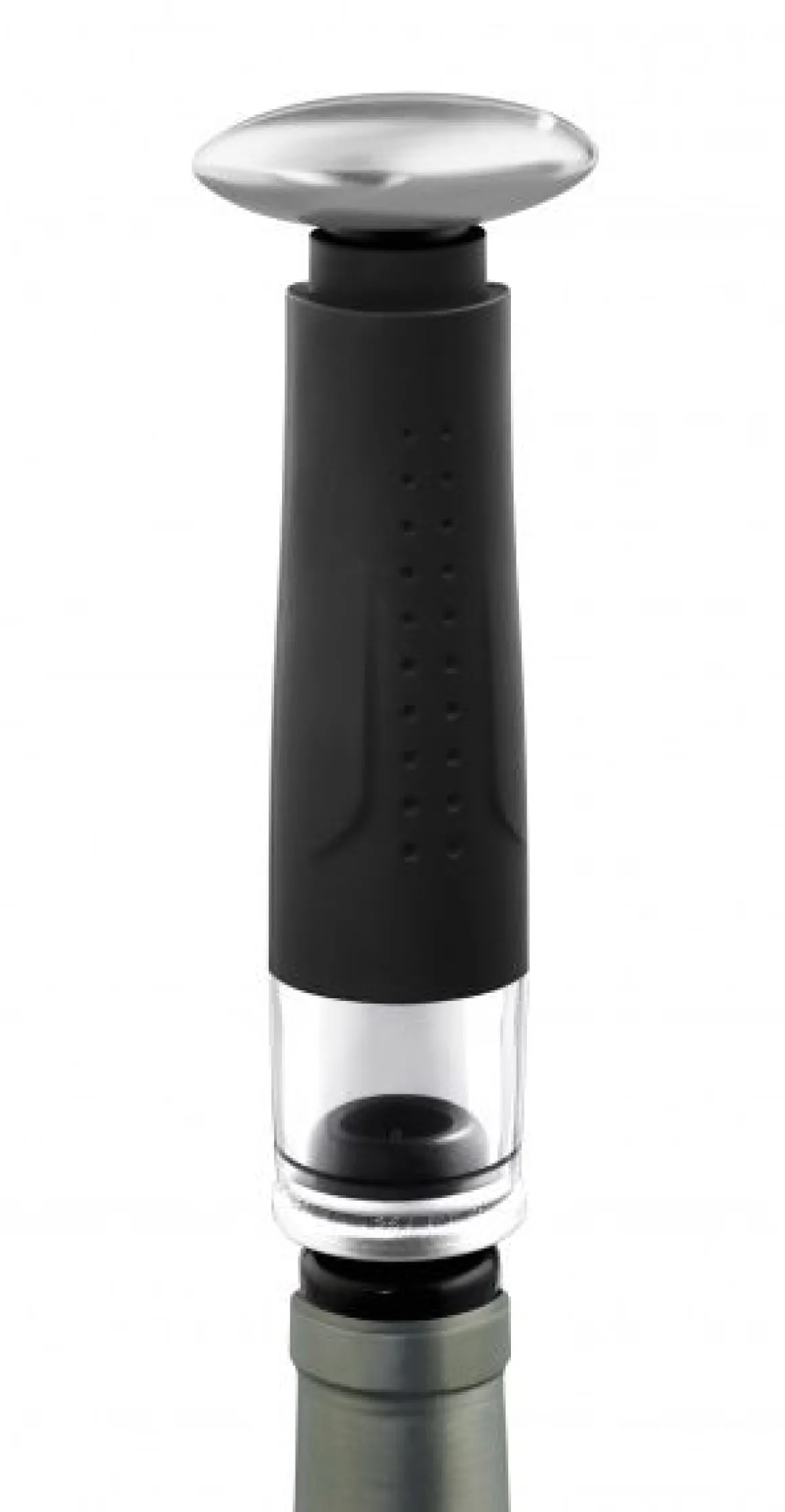 Stecken sie einen der Stopfe in den Flaschenhals und setzen die Vakuumpumpe auf den Stopfen. Durch Pumpen mit dem silbernen Griff ziehen sie die Luft aus der Flasche. So schützen sie den Wein vor zu schnellem oxidieren. Zum Öffnen drücken sie den Vakuumstopfen oben leicht zusammen, so dass Luft wieder in die Flasche gelangt. Jetzt können sie den Stopfen einfach aus der Flasche ziehen.