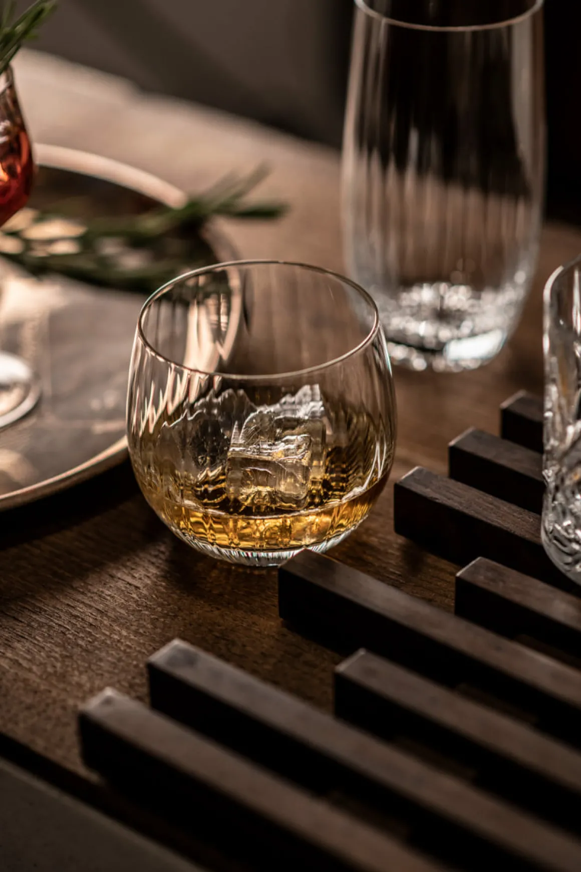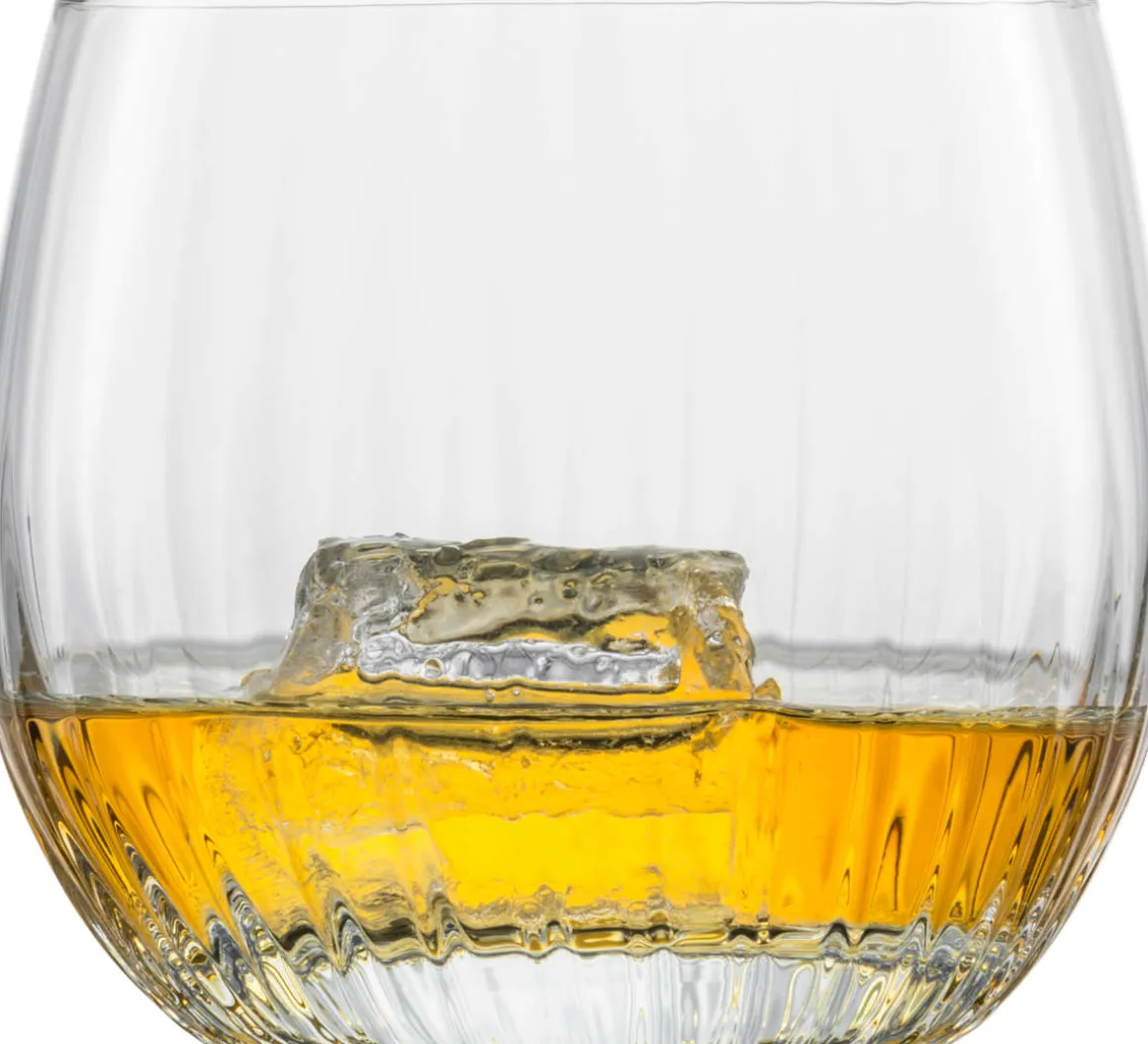 Whisky Tumbler aus der Serie Fortune von Schott Zwiesel. Diese Serie wurde für das Jahr 2021 in Melody umbenannt. Der Tumbler ist rundlich geformt und besitzt ein umlaufendes senkrechtes Rillenmuster. Der elegante Whisky Tumbler Fortune weicht so weit genug vom typischen zylinderförmigen Standard ab um interessant zu sein, ohne dass das Design aufdringlich wirkt. Servieren sie Cocktails oder Whisky in diesem Tumbler. Er eignet sich auch gut als Wasserglas.