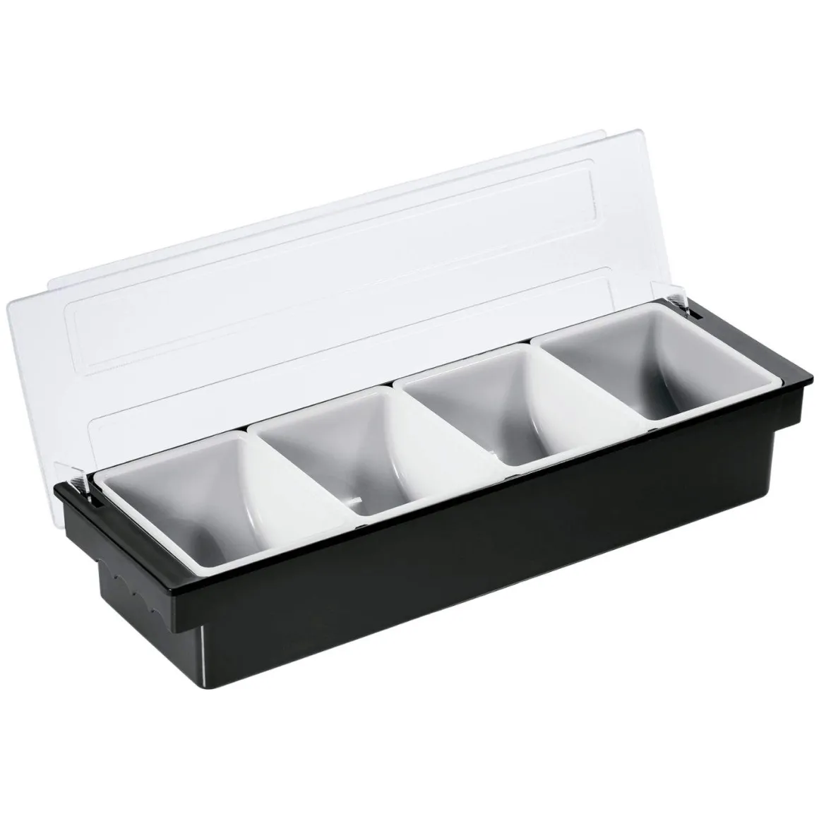 Dieser Zutatenbehälter mit vier großzügigen Fächern ist ideal, um schnell auf frische Bar-Zutaten wie Garnituren, Früchte oder Toppings zuzugreifen. Jedes Fach fasst 0,75 Liter und bietet damit ausreichend Platz für den professionellen Einsatz an der Bar oder im Service.