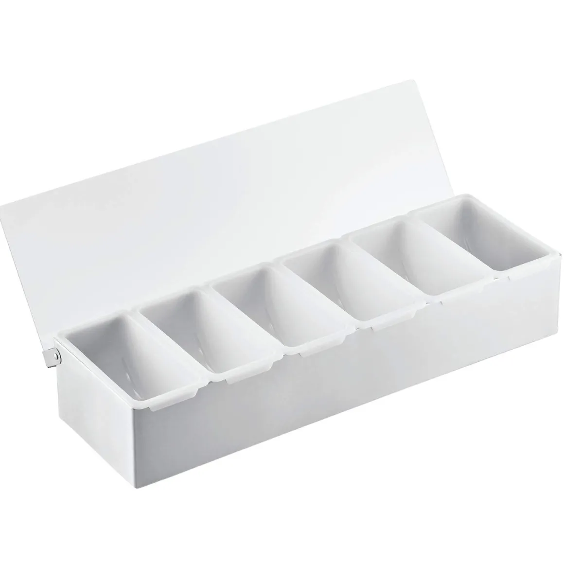Dieser Zutatenbehälter aus Edelstahl verbindet hygienisches Material mit funktionalem Design. Die sechs Einsätze aus Kunststoff mit einem Volumen von jeweils 0,45 Litern ermöglichen eine saubere und übersichtliche Aufbewahrung von Bar-Zutaten.